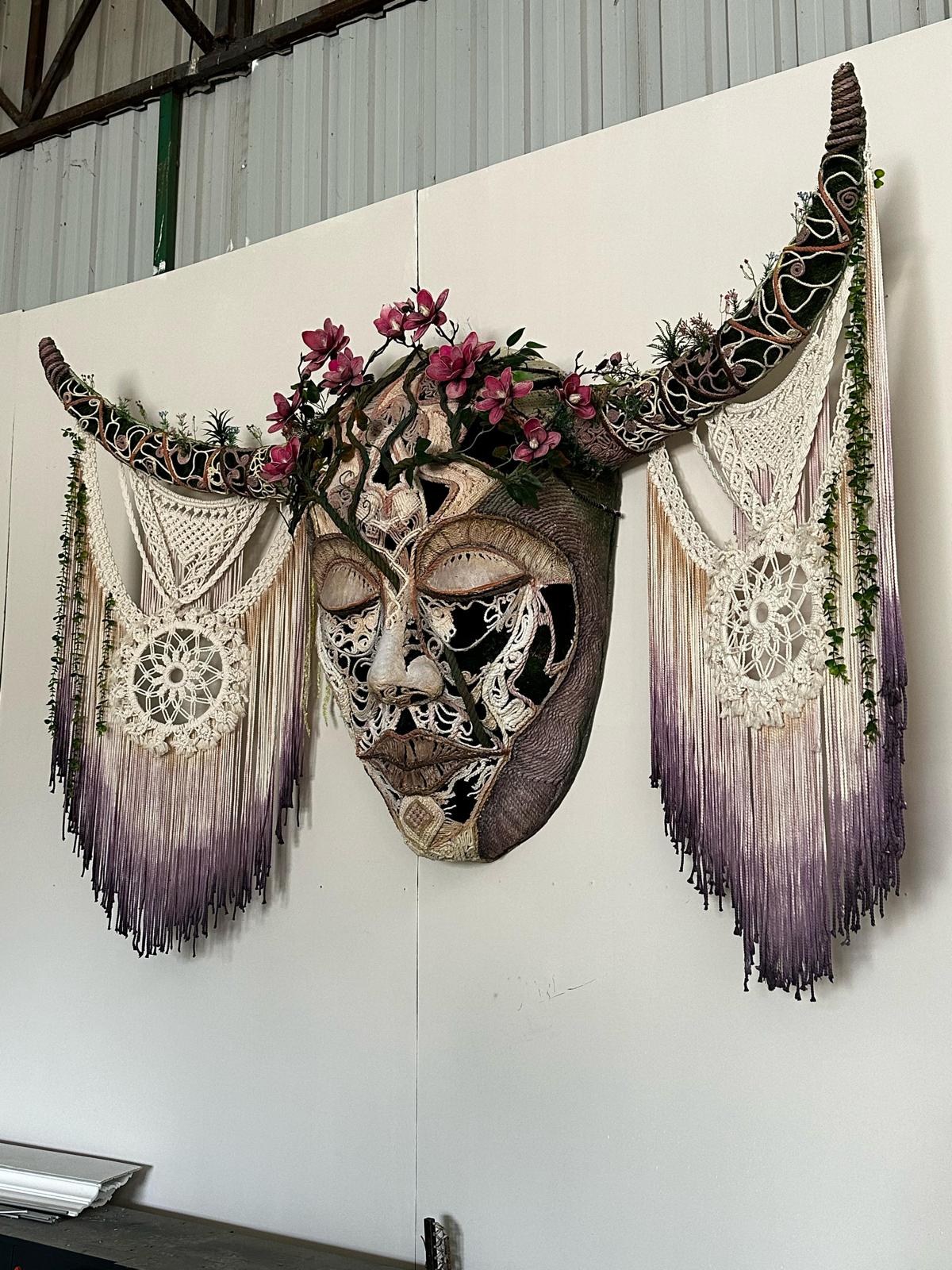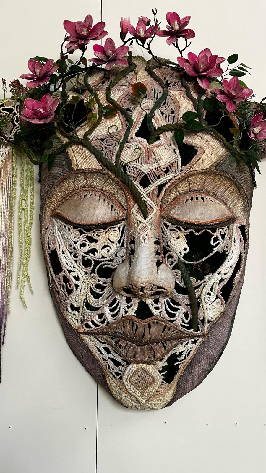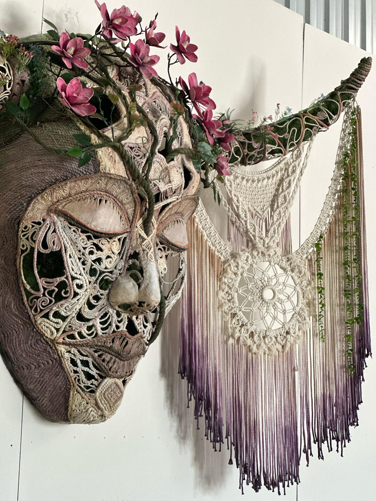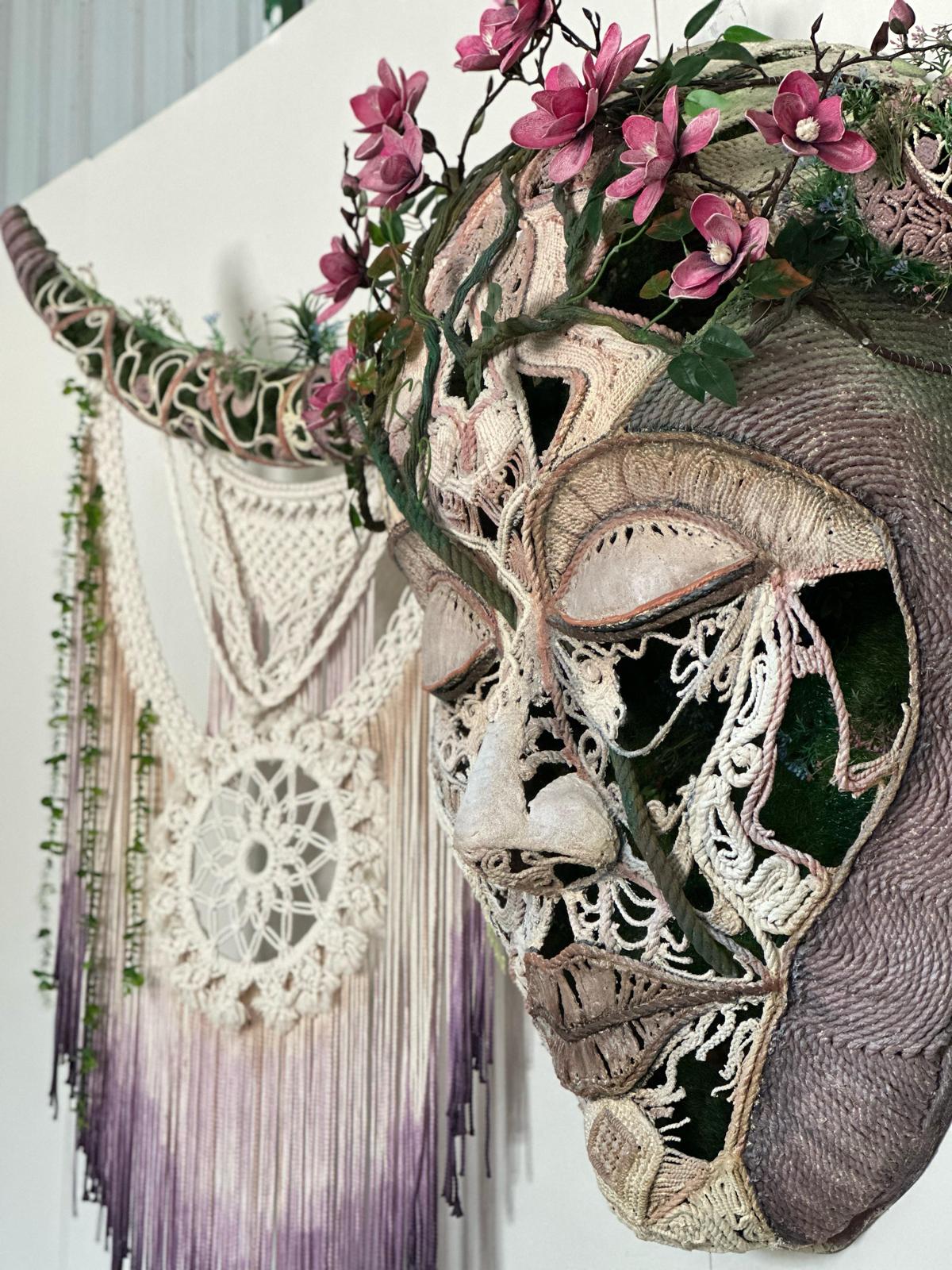 Reflecting the texture of nature and the cycle of life, this unique work comes alive with elements if of woven cotton threads. Hidden inside the face sculpture, the colorful flowers scattered on the green grass reflect the vitality of nature and the joy of its colors. This work, which takes on a different color every moment with the play of light, reveals a story as if it has been hidden in nature for years. Representing the perfect harmony of natural beauty and man-made art, this work invites viewers to experience the magic of nature and to ponder the eternity of life.